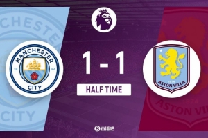 半场-曼城暂1-1维拉 B席建功 拉什福德中柱+点射扳平