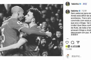 体育资讯7月3日讯 利物浦前锋若塔因车祸不幸离世,昔日红军战友法比尼奥通过社媒晒照发文哀悼。