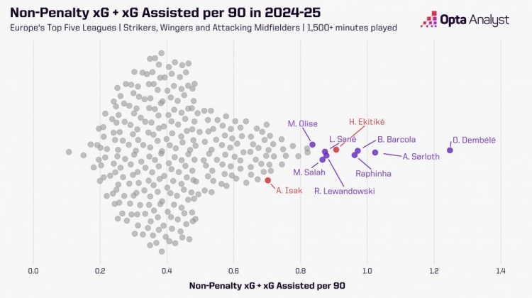 数据统计显示,不计点球情况下,埃基蒂克上赛季在联赛的每90分钟预期参与进球值高达0.91,这一数字仅次于登贝莱、索尔洛特、巴尔科拉和拉菲尼亚,在同期至少出场1500分钟 的五大联赛前场球员(中锋、边锋和前腰)位列第5位。